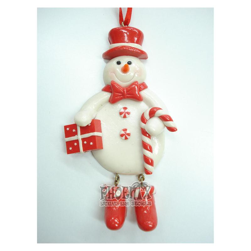 Χιονάνθρωπος με μπαστούνι και δώρο. Χριστουγεννιάτικα Στολίδια παιδικά κρεμαστά, από άργιλο και πηλό πολύ καλής ποιότητας. Πολύ όμορφες χριστουγεννιάτικες φιγούρες, σε γιορτινά χρώματα, εξαιρετικά στη λεπτομέρειά τους.