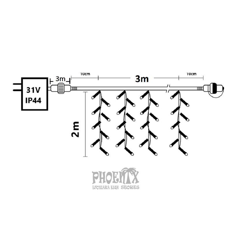 Χριστουγεννιάτικα Φωτάκια Κουρτίνα Εξωτερικού Χώρου 400LED Θερμό 3m X 2m Με Επέκταση. Φωτάκια κουρτίνα εξωτερικού χώρου 31V (IP44), με 400 LED λαμπάκια με θερμό φως, σταθερή, με διάφανο καλώδιο, επέκταση και μήκος 3 μέτρα και ύψος 2 μέτρα.